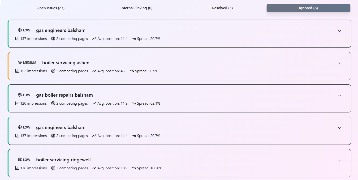 Identify pages competing for the same keywords, get instant fixes, and consolidate authority to skyrocket rankings—without spreadsheets.
