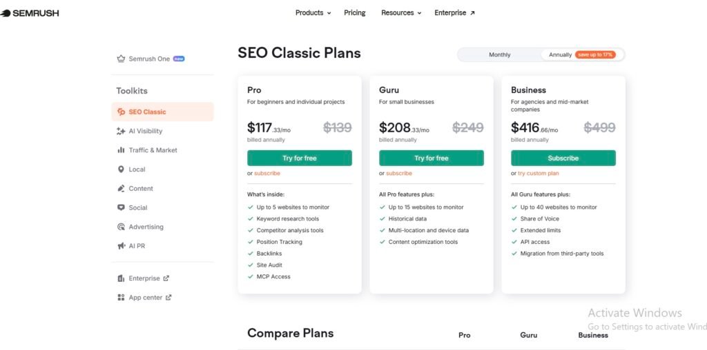Semrush offers three SEO Classic plans. You can pay monthly or save up to 17% by going annual. Here is exactly what each plan costs and what you get with it.