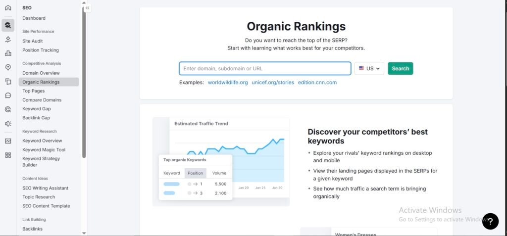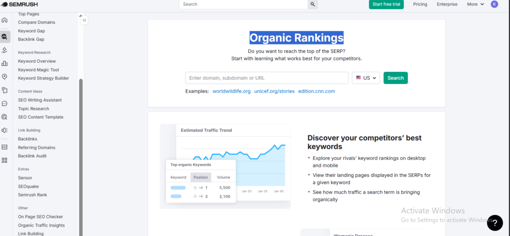 Semrush’s Organic Research tool helps you see what keywords your competitors are ranking for.