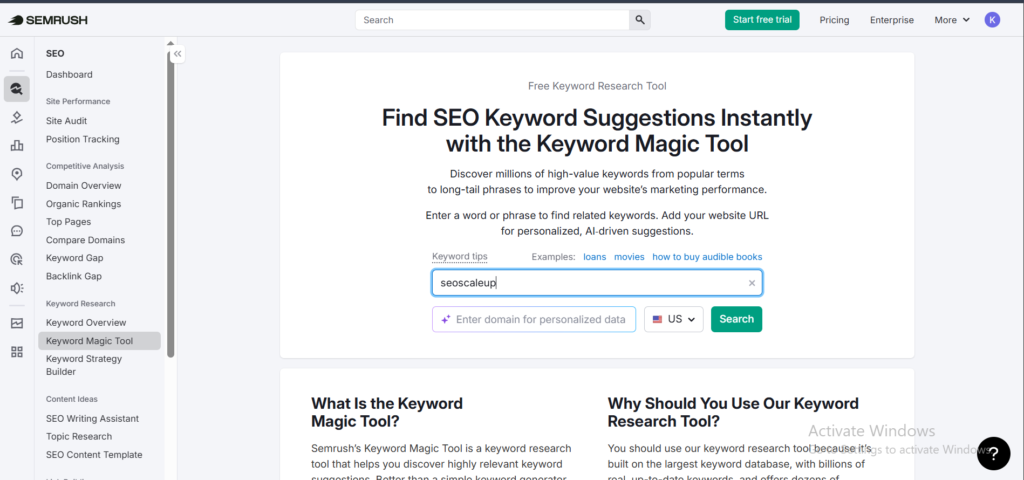 Semrush’s Keyword Magic Tool makes keyword research very easy and powerful.