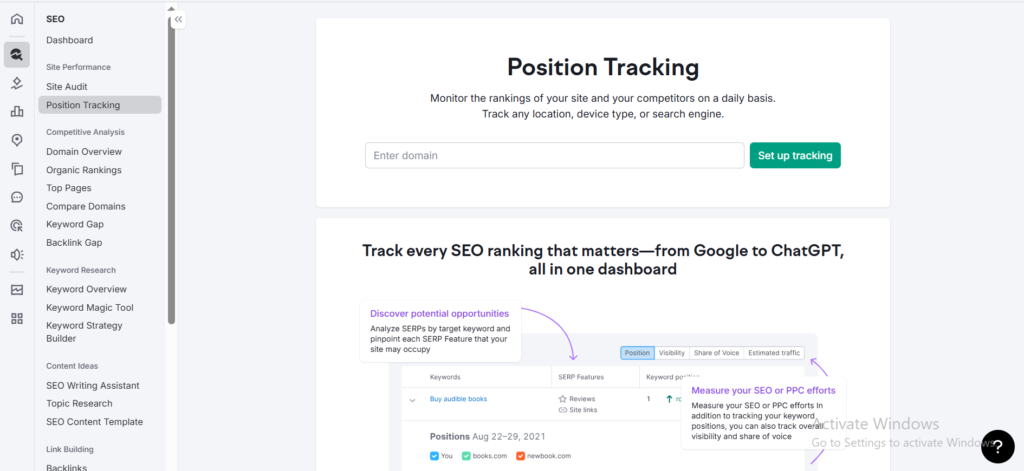 Semrush’s Position Tracking tool helps you see how your keywords are ranking every day.