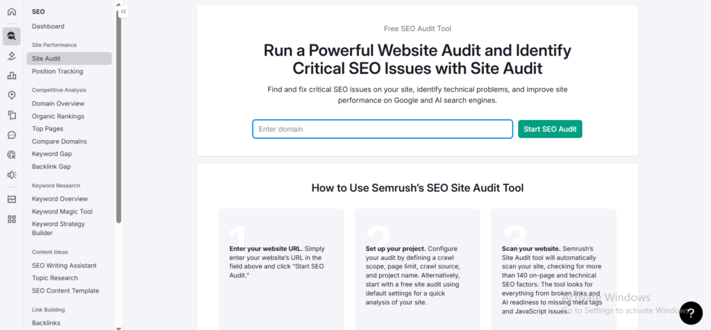 Semrush’s Site Audit tool checks your website for SEO problems quickly.