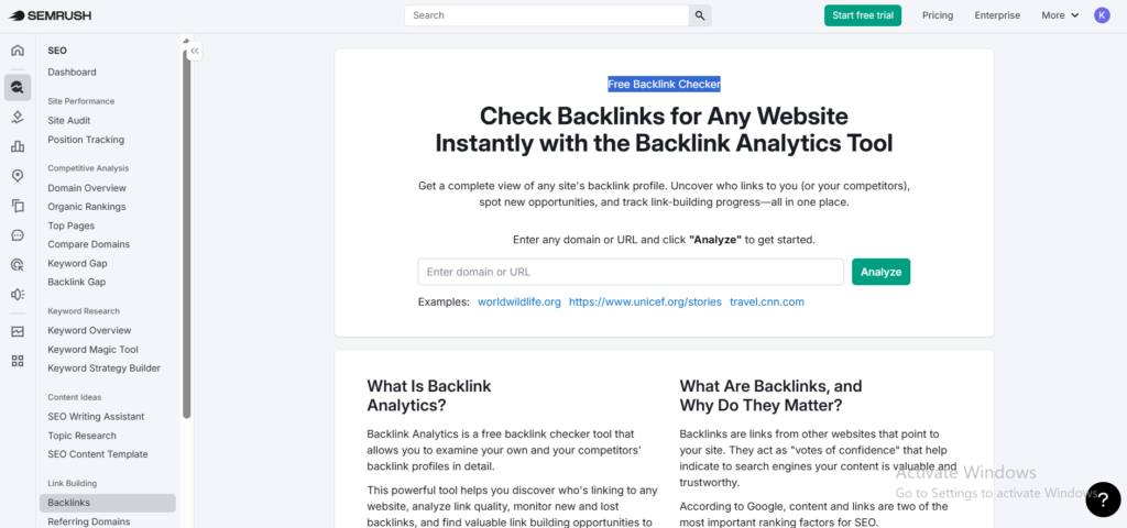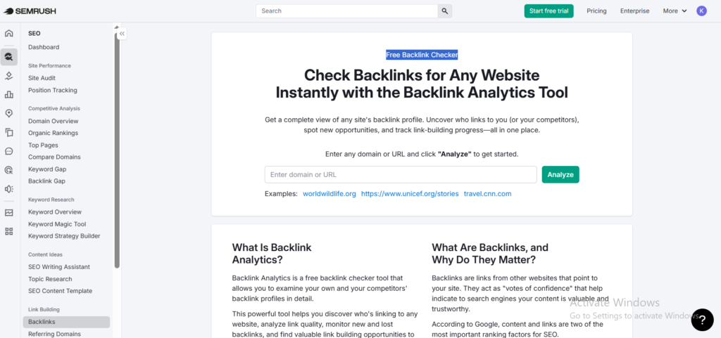 Semrush’s Backlink Analytics tool helps you understand your website’s backlinks in detail.