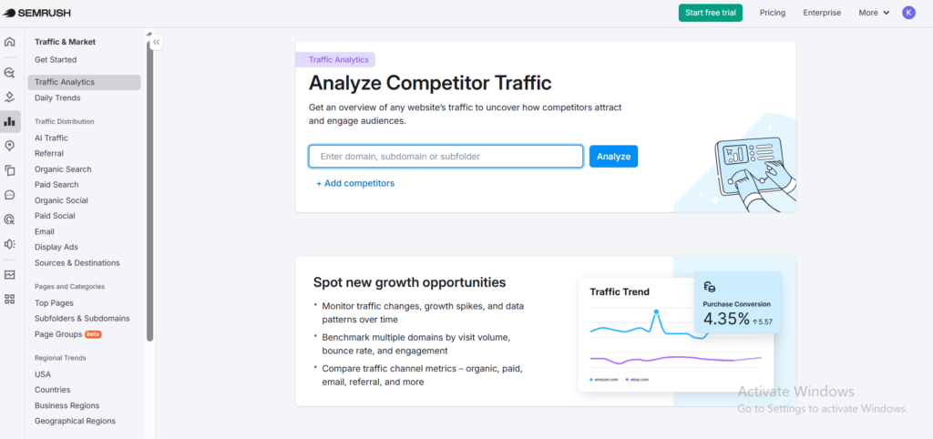 Most SEO tools tell you what keywords a competitor ranks for. Semrush’s Traffic Analytics goes a step further — it tells you where their visitors actually come from and how those visitors behave once they arrive.