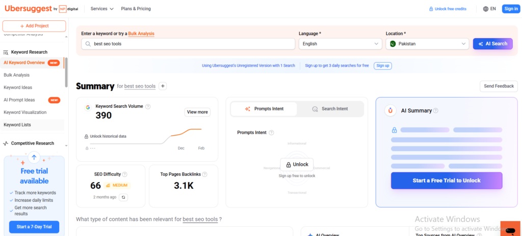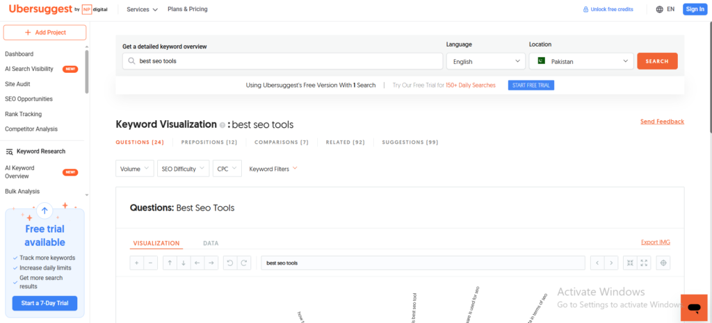 But here’s the honest part — Ubersuggest has limits. The keyword database is smaller. The site audit struggles on bigger websites. And if you need PPC research or advanced content tools, you won’t find them here.