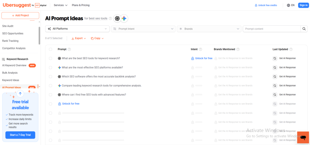 Ubersuggest’s AI Prompt Ideas feature helps you discover what people are searching for.