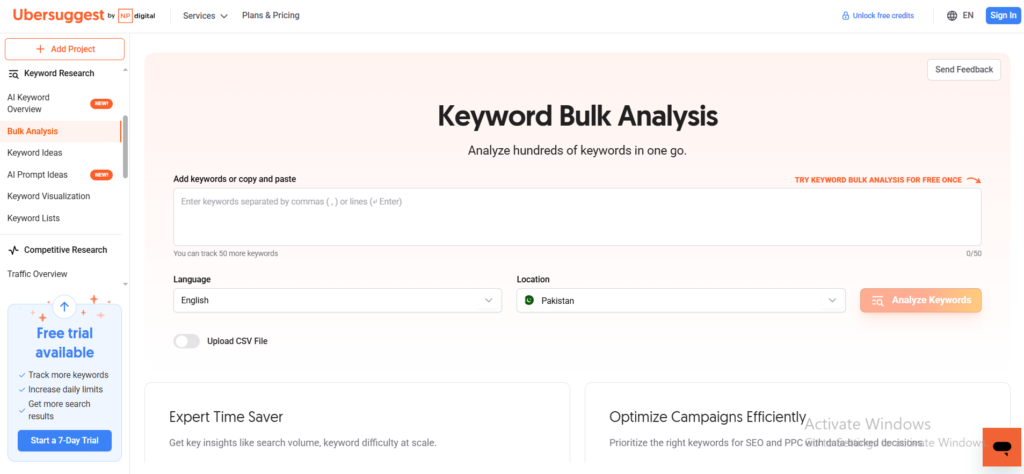 Ubersuggest’s Keyword Bulk Analysis feature lets you analyze many keywords at once.