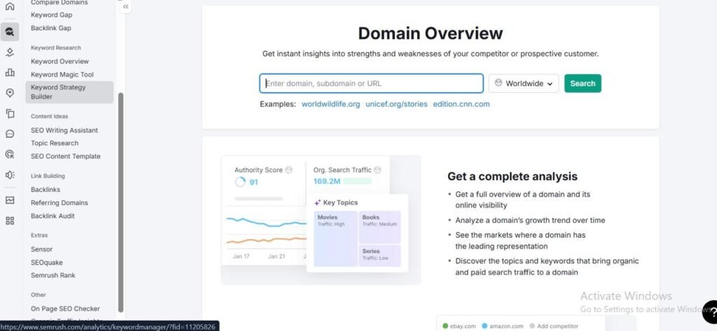 Semrush’s Domain Overview tool gives a complete picture of any website in just a few seconds. You can see traffic, top keywords, backlinks, and competitor data all in one place. It works for websites from different countries, so you can analyze global competitors easily. The data is detailed and more advanced compared to many other SEO tools. This makes it very useful for quickly understanding how a website is performing and where it stands in the market.